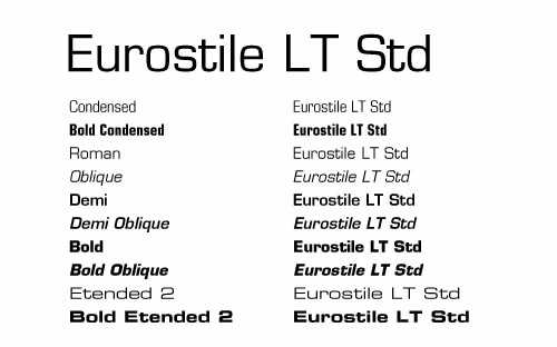 Eurostile 的大名就不用多说了,Eurostile LT Std包含10种字型Condensed,Bold Condensed,Roman,Oblique,Demi,Demi Oblique,Bold,Bold Oblique,Etended 2,Bold Etended 2。