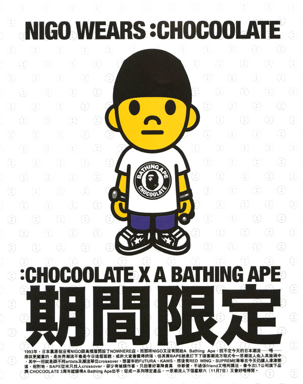 为了庆祝香港I.T集团旗下的本土品牌Chocoolate成立3周年,其特别邀请到与I.T关系密切的A BATHING APE与其合作推出了三周年限定单品。整个系列包括了T-shirt、网眼帽、马克杯等单品,将于11月7日开设的期间形象店中发售,期间形象店为期6天,喜欢的朋友不要错过了这个大好机会。